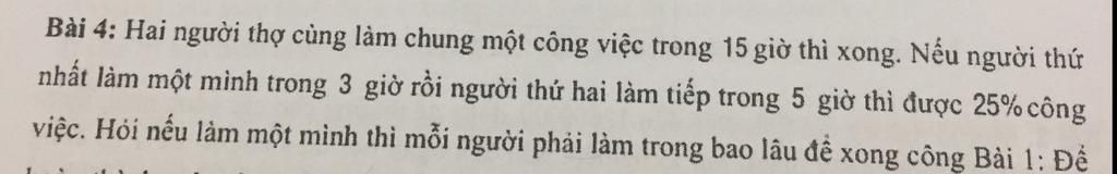 Người t1 làm trong 3h r người t2 làm trong 5 h tiếp thêo thì đc 25% cv: