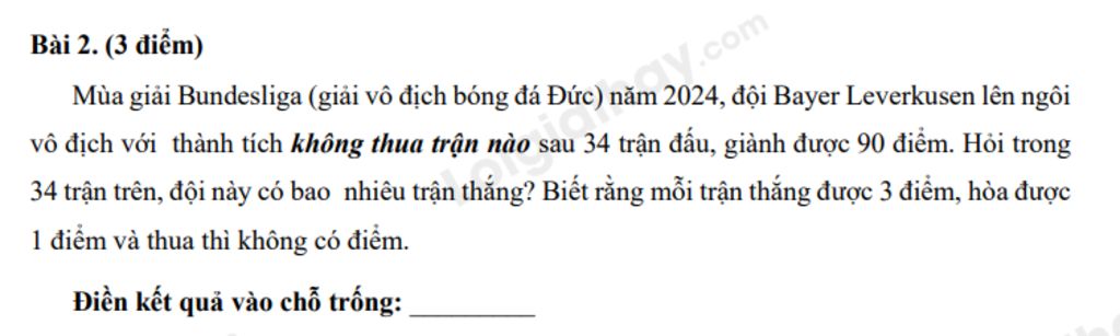 Mùa giải Bundesliga (giải vô địch bóng đá Đức) 2024, đội Bayer Leverkusen lên ngôi vô địch với thành tích không thua trận nào sau 34 trận đấu, giành được 90 điểm. Hỏi trong 34 trận trên, đội này có bao nhiêu trận thắng? Biết rằng mỗi trận thắng được 3 điểm, hòa được 1 điểm và thua thì không có điểm.