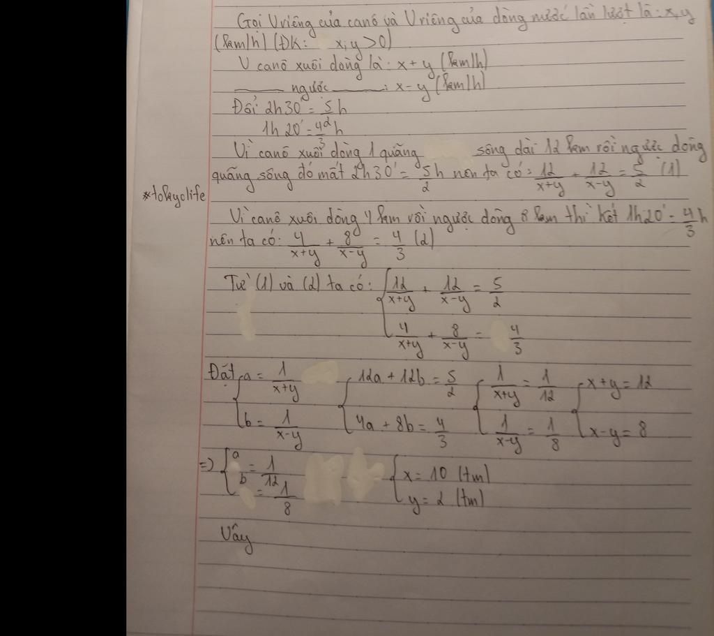 Một ca nô xuôi dòng một quãng sông dài `12km` rồi ngược dòng quãng sông đó mất `2h30'`. Nếu cũng trên quãng sông ấy, ca nô xuôi dòng `4km` rồi ngược dòng `8km` thì hết `1h20'`. Tính vận tốc riêng của ca nô và vận tốc riêng của dòng nước.
