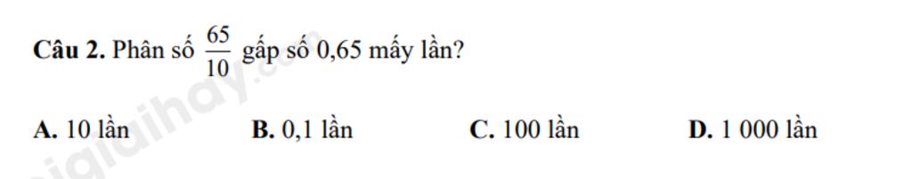 Phân số $\frac{65}{10}$ gấp số 0,65 mấy lần?