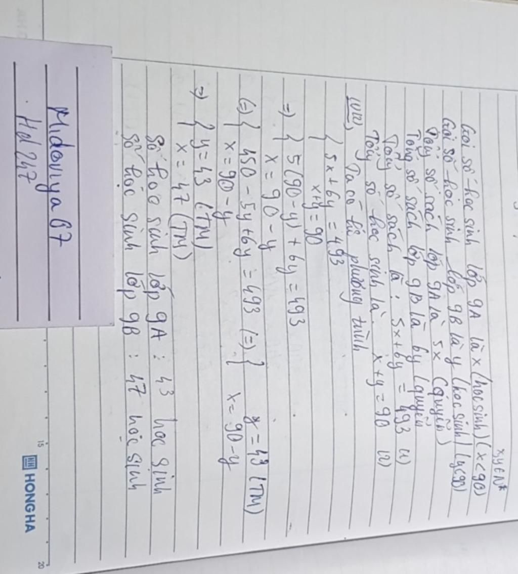 Cả hai lớp `9A` và `9B` có tất cả số học sinh là:`x+y=90(học sinh)`