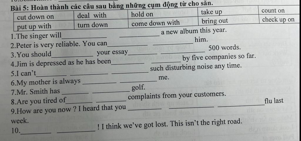 `5.` put up with (phr, v): chịu đựng.