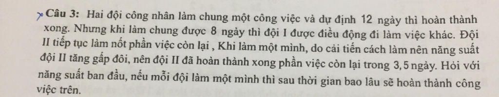 Nên còn lại đội $II$ phải hoàn thành một mình $1-\frac{2}{3} = \frac{1}{3}$ (công việc)