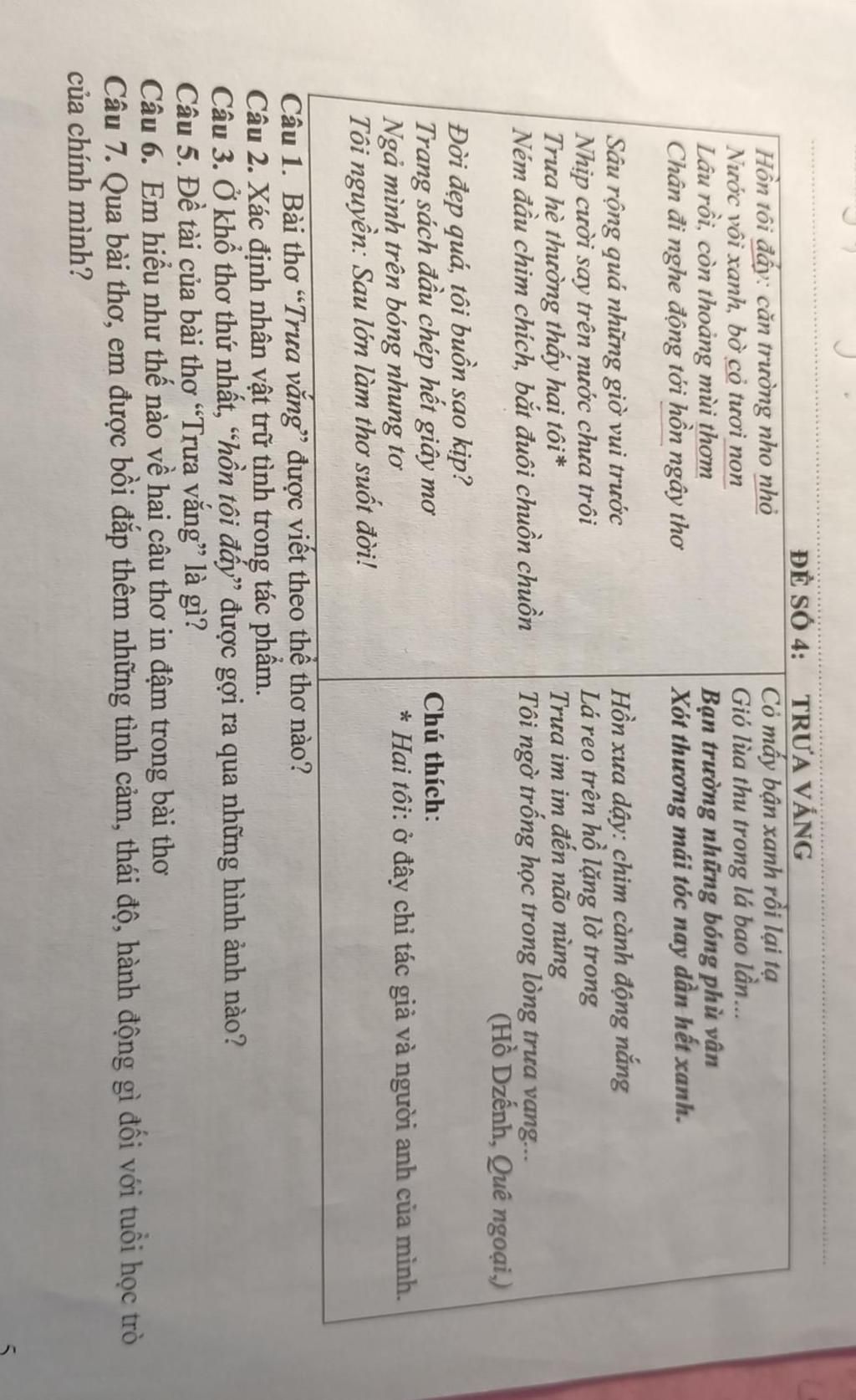 câu 7 Đối với em, tuổi học trò là một thứ gì đó rất trong sáng, vô giá và đặc biệt qua bài thơ thì điều ấy càng trở nên thiêng liêng hơn bao giờ hết. Tuổi học trò mang đến cho mỗi người những kiến thức, tình bạn, tình thầy trò và những kỉ niệm khó quên. Đó là những kỉ niệm quý giá, đem đến cảm giác tiếc nuối mỗi khi hồi tưởng mà chắc hẳn bất kì ai trong chúng ta cũng muốn sống lại trong đó nhiều lần nữa.