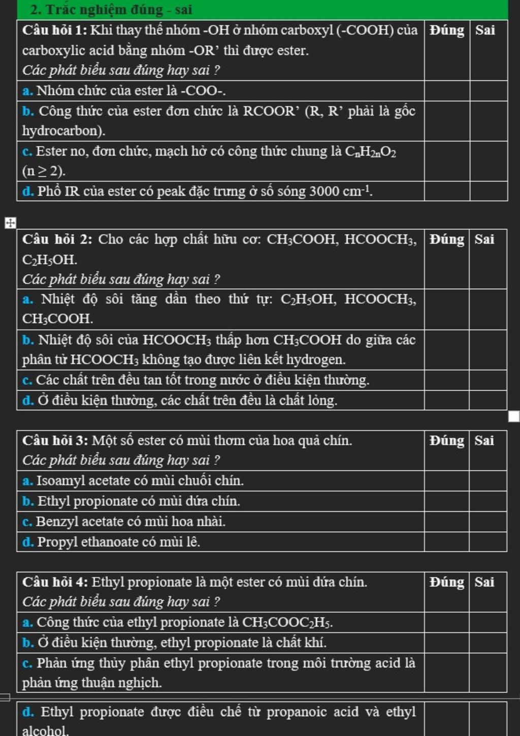 | Câu hỏi 1: Khi thay thế nhóm -OH ở nhóm carboxyl (-COOH) của | Đúng Sai