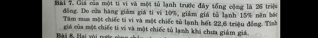 Giá của một chiếc ti vi và tủ lạnh trước đây tổng cộng là `26` triệu đồng