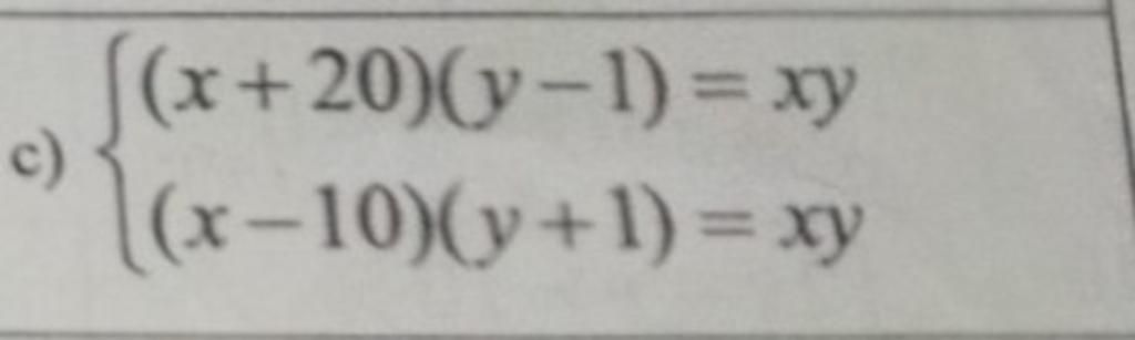 `{(( x + 20)( y - 1 ) = xy),(( x - 10 )( y + 1 ) = xy):}`