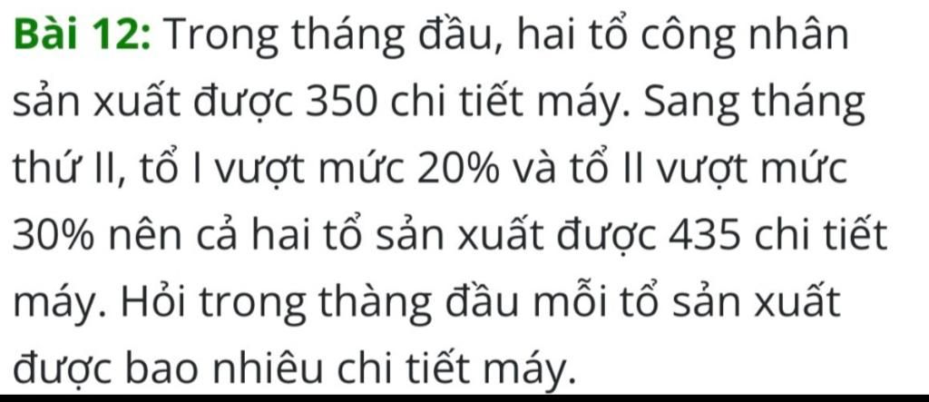 Số chi tiết máy trong tháng đầu tổ 2 sản xuất được là: `350 - x` (chi tiết máy)