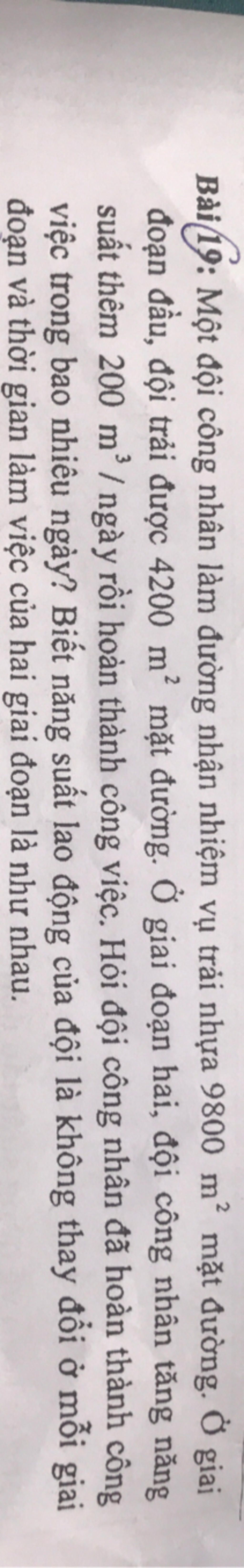 Bài 19: Một đội công nhân làm đường nhận nhiệm vụ trải nhựa 9800 m mặt đường. Ở giai