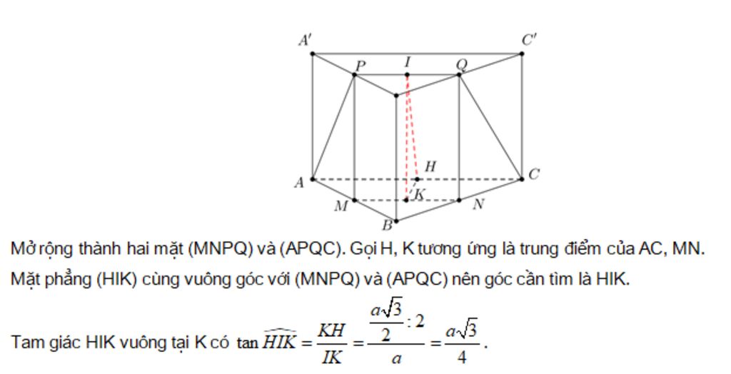 Cho hình lăng trụ tam giác đều ABC.A'B'C' có tất cả các cạnh bằng a. Gọi M, N, P lần lượt là trung điểm của AB, BC và A'B' . Tang của góc giữa hai mặt phẳng (MNP) và (ACP) bằng ?