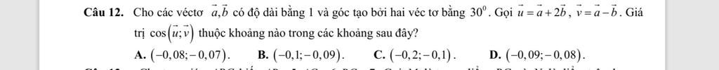 Do đó `cos(vecu,vecv)=(vecu.vecv)/(|vecu|.|vecv|)=((-2+sqrt3)/2)/(sqrt(5+2sqrt3) .sqrt(2-sqrt3))~~-0,089`