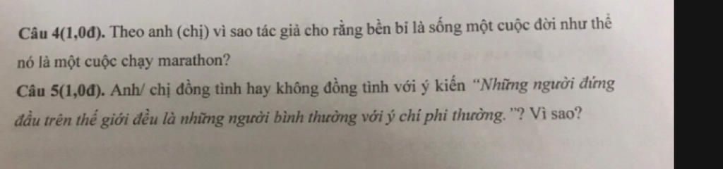 `+` Theo tôi hiểu ý kiến trên của tác giả có nghĩa là trong cuộc sống bền bỉ cũng giống như chạy marathon, ta cần biết cân bằng và điều hòa nhịp sống của mình thay vì cứ mãi chạy thật nhanh dồn hền tốc lực thì nên biết cân bằng cuộc sống, nhịp sống của bản thân để cho mình có cuộc sống bền bỉ mà không quá nhanh cũng không quá chậm.