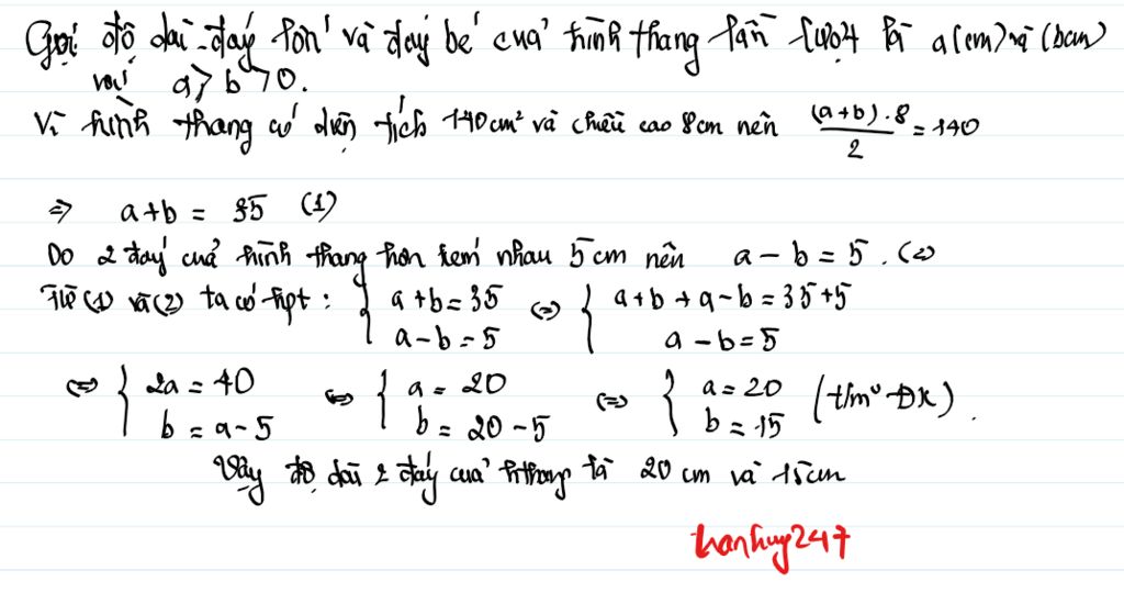 một hình thang có diện tích 140 cm^2, chiều cao 8cm.tính độ dài các đáy của hình thang bt rằng chúng hơn kém nhau 5 cm