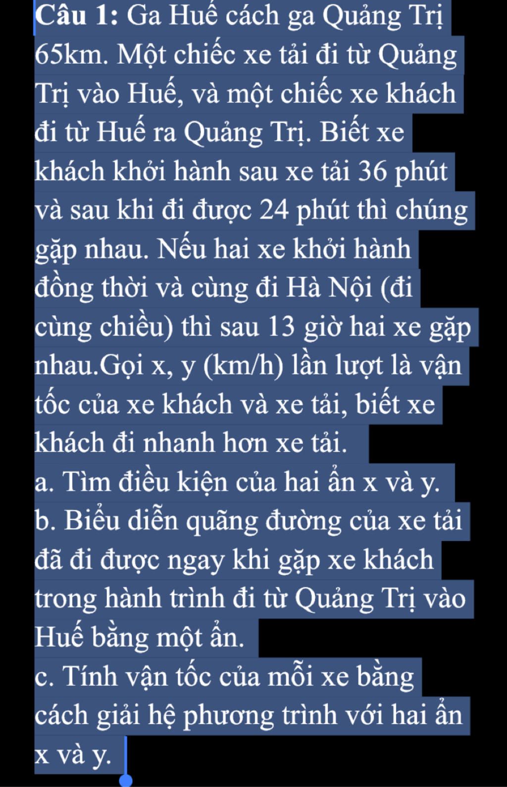 a.Vì $x,y$ là vận tốc của xe khách và xe tải, xe khách đi nhanh hơn xe tải