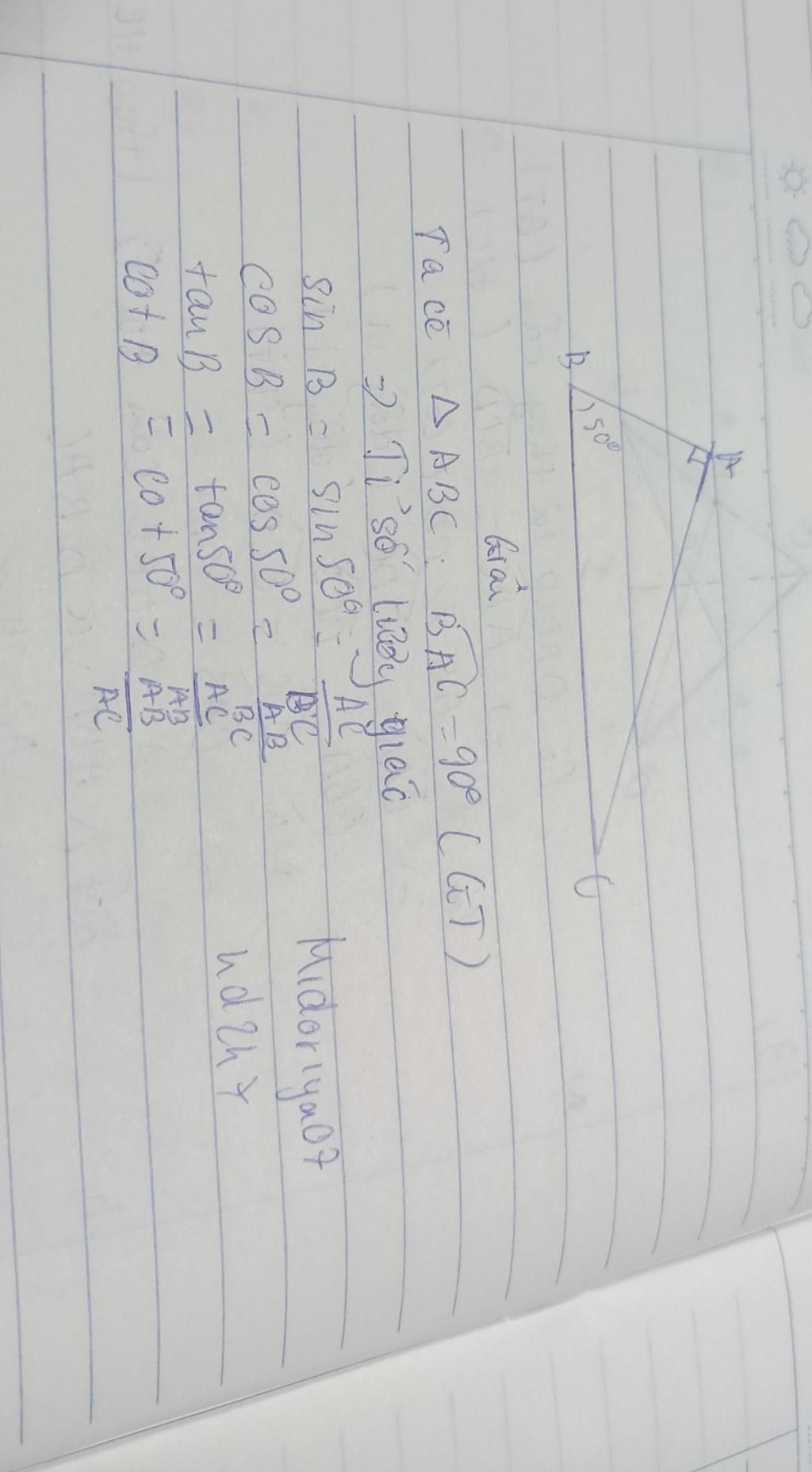 cho tam giác abc vuông tại a biết góc B =50 độ . viết tỉ số lượng giac của góc b