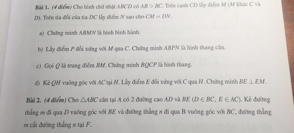 Bài 1. (4 điểm) Cho hình chữ nhật ABCD có AB > BC. Trên cạnh CD lấy điểm M (M khác C và