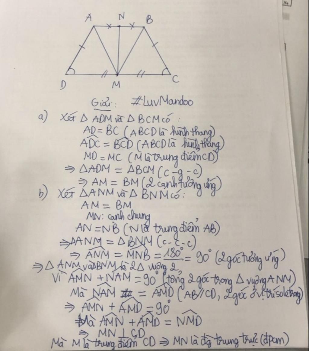 Cho hình thang cân ABCD có AB song song với CD. Lấy M, N lần lượt là trung điểm CD, AB.