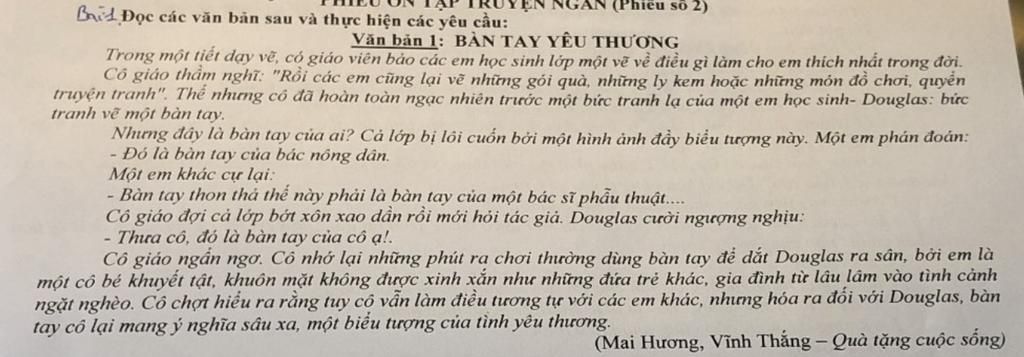 Cô giáo là người có trái tim nhân hậu, bao dung, yêu thương học trò của mình. Douglas là nhân vật có thái độ sống biết ơn, trân trọng tình yêu thương mà cô giáo dành cho mình thể hiện qua bức vẽ bàn tay cô giáo của mình.