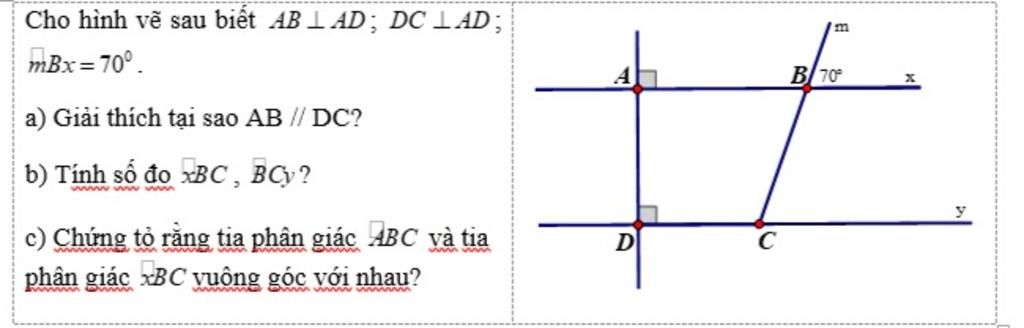 `to \hat{mBx}=\hat{BCy}=70^{o}` ( `2` góc đồng vị )