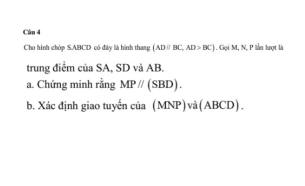 Cho hình chóp SABCD có đáy là hình thang (AD// BC, AD>BC). Gọi M, N, P lần lượt là