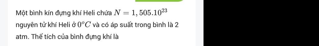 `<=> V = [N R (273 + t)]/N_A = [1,595.10^[23] . 0,082.(273 + 0)]/[6,022.10^[23]] approx 5,93 (l)`