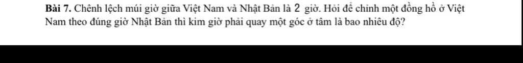 Để tính góc quay của kim giờ khi chỉnh đồng hồ từ giờ Việt Nam sang giờ Nhật Bản với sự chênh lệch múi giờ là 2 giờ, bạn cần biết rằng kim giờ di chuyển bao nhiêu độ trong một giờ.