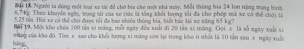 Gọi `x` là số thùng bia tối đa xe có thể chở `(x \in NN^**)`