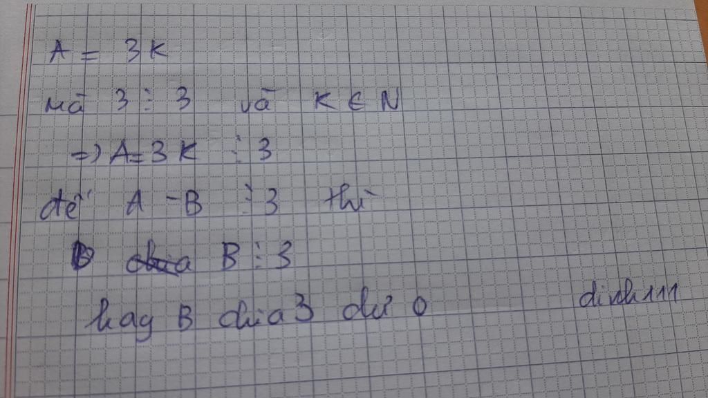 Để A `-` B chia hết cho `3` mà A `=` `3k` chia hết cho `3`