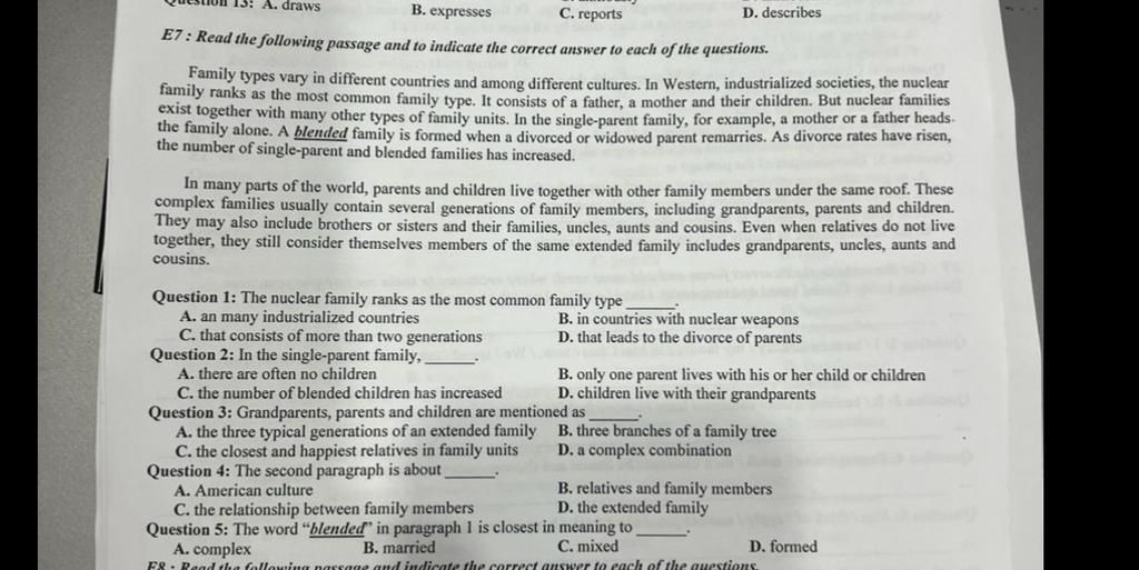 + Câu 2: These complex families usually contain several generations of family members, including grandparents, parents and children.