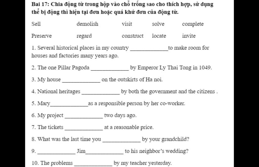 Bai 17: Chia động từ trong hộp vào chỗ trống sao cho thích hợp, sử dụng
