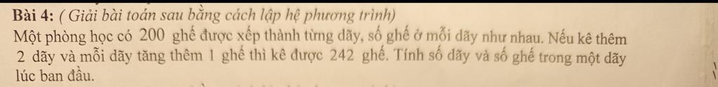 (giải bài toán sau bằng cách lập hệ phương trình) một phòng học của 200 ghế được xếp thành từng dãy, số ghế ở mỗi dãy như nhau. Nếu kê thêm hai dãy và mỗi dãy tăng thêm một ghế thì kê được 242 ghế. Tính số dãy và số ghế trong một dãy lúc ban đầu.