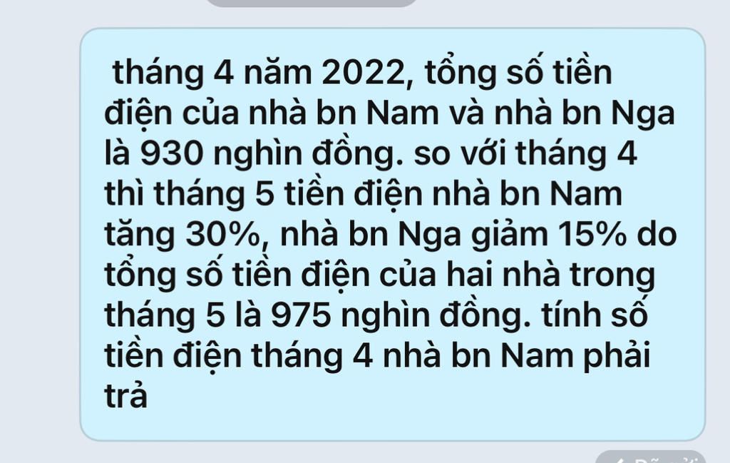 Tổng số tiền điện của nhà hai bạn trong tháng `5` là `975,` ta được phương trình: