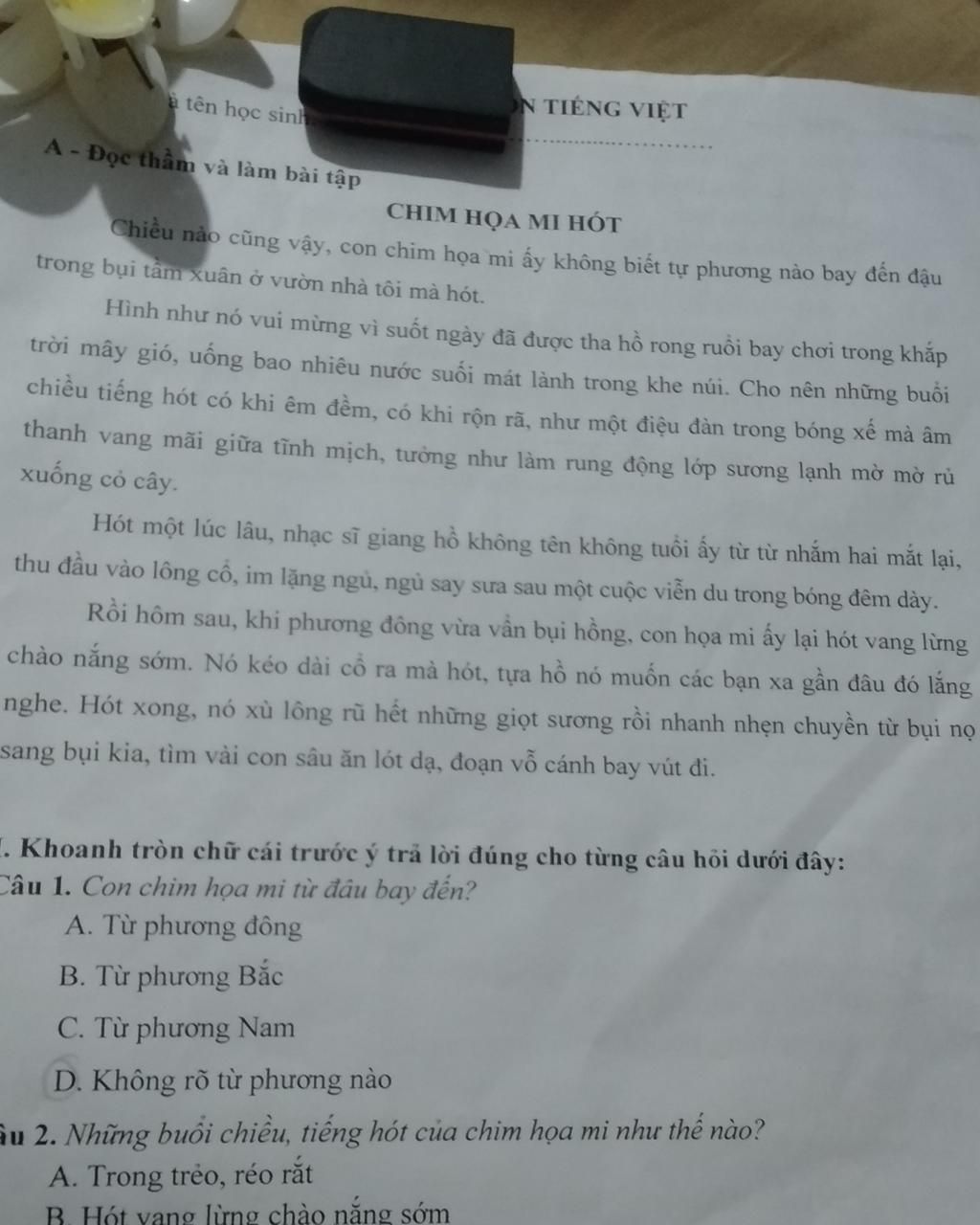 `@` Hai câu:"Khi phương đông vừa vẩn bụi hồng, con hoạ mi ấy lại hót vang lừng chào nắng sớm. Nó kéo dài cổ họng ra mà hót, tựa hồ nó muốn các bạn xa gần đâu đó lắng nghe."