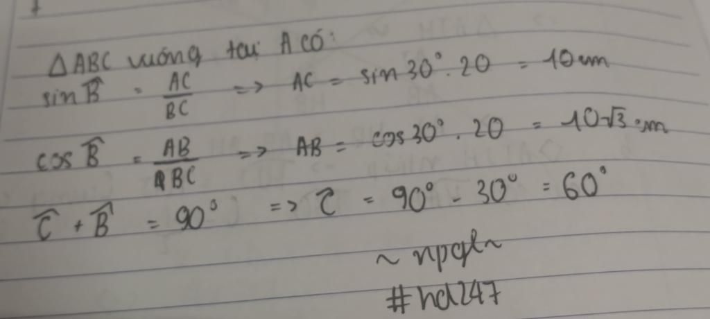 Giải tam giác ABC vuộng tại A biết: BC=20cm, góc B=30 độ