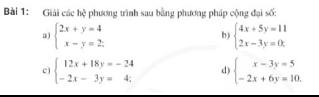 b) `{(4x + 5y = 11),(2x - 3y = 0):}`