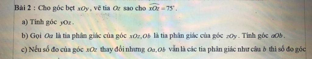 Bài 2 : Cho góc bẹt xOy, vẽ tia Oz sao cho xOz =75° .