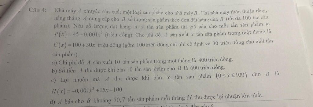 Nhà máy 4 chuyên sản xuất một loại sản phẩm cho nhà máy B. Hai nhà máy thỏa thuận rằng,
