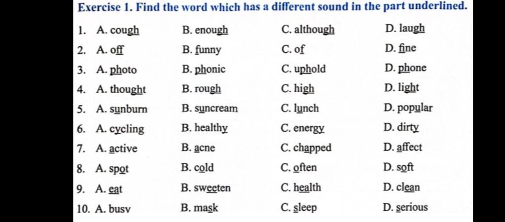 Exercise 1. Find the word which has a different sound in the part underlined.
