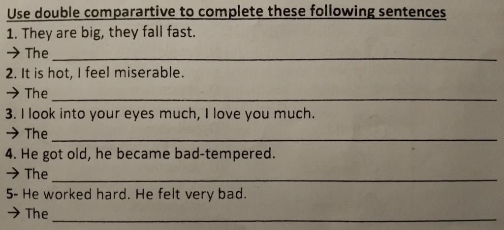 `5,` The harder he worked, the worse he felt.