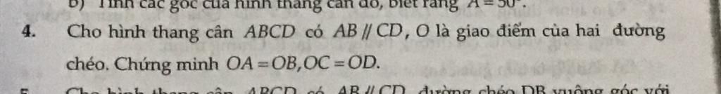 b4: cho hình thang cân abcd có ab//cd, O là giao điểm của 2 đường chéo. Cm: OA=OB,OC=OD
