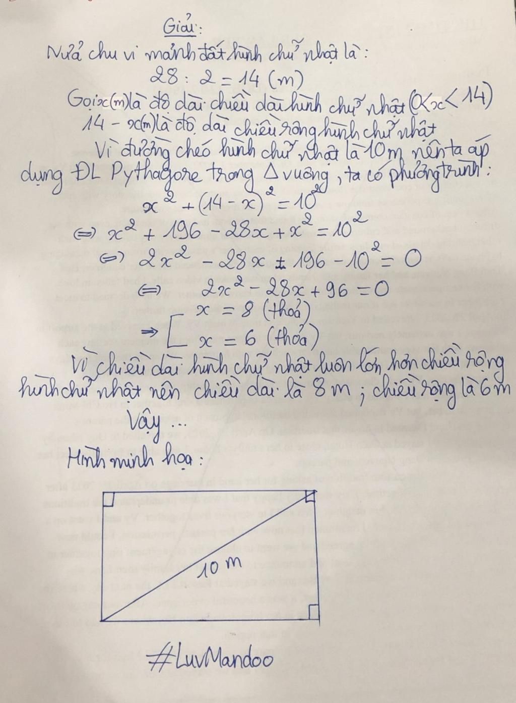 Một mảnh đất hình chữ nhật có chu vi bằng 28m. Đường chéo hình chữ nhật là 10m. Tính độ dài hai cạnh của mảnh đất hình chữ nhật. Giải chi tiết giúp mik nhé