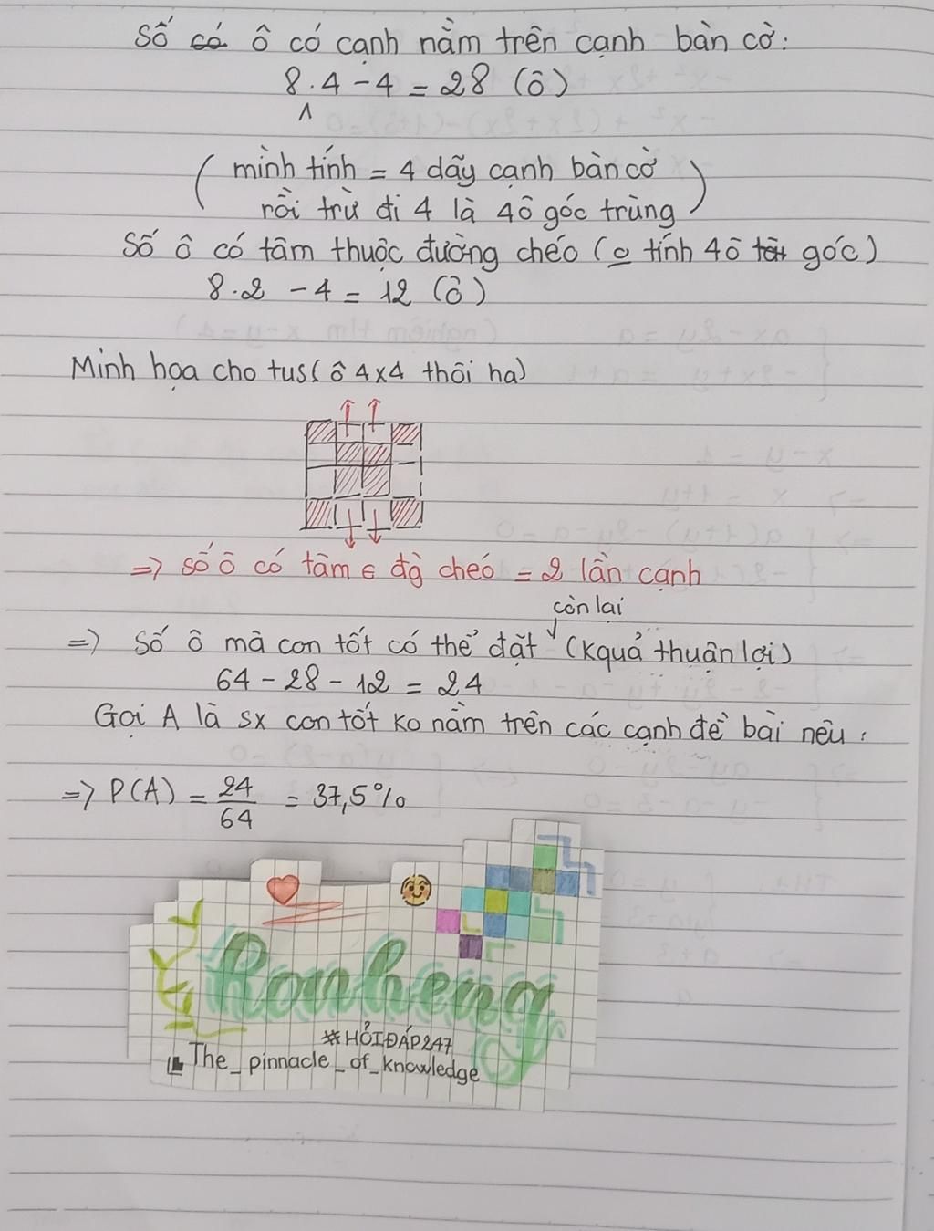 Trên bàn cờ vua kích thước 8 × 8 gồm 64 ô vuông con kích thước 1 x 1. Đặt ngẫu nhiên một quân Tốt vào một ô vuông con kích thước 1 x 1 trên bàn cờ. Tính xác suất để ô vuông con kích thước 1 x 1 mà con Tốt được đặt không có tâm nằm trên đường chéo của bàn cờ và cũng không có cạnh nào nằm trên cạnh của bàn cờ (hình vuông kích thước 8 x 8).