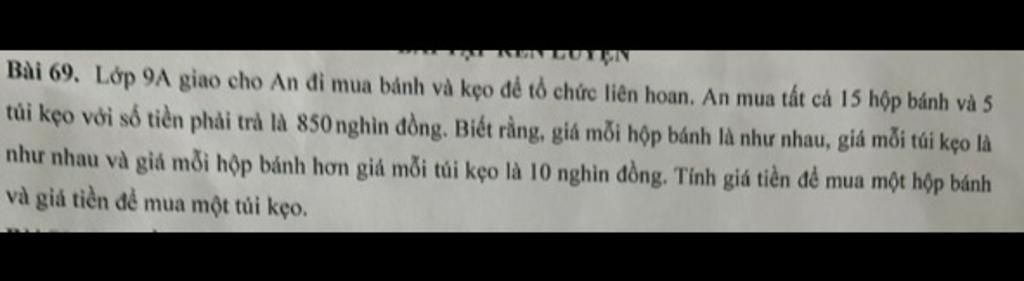 $\text{Gọi x là giá tiền một hộp bánh và y là giá tiền mua một túi kẹo ( x,y ∈ N* )}$