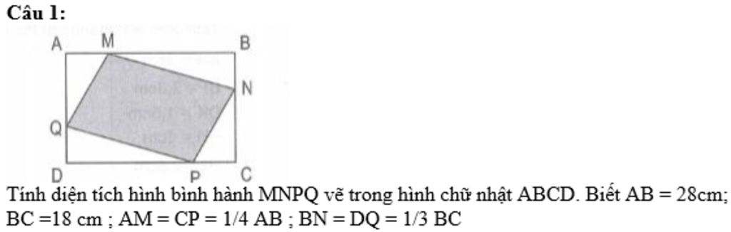Diện tích hình bình hành MNPQ bằng diện tích hình chữ nhật ABCD trừ đi tổng diện tích