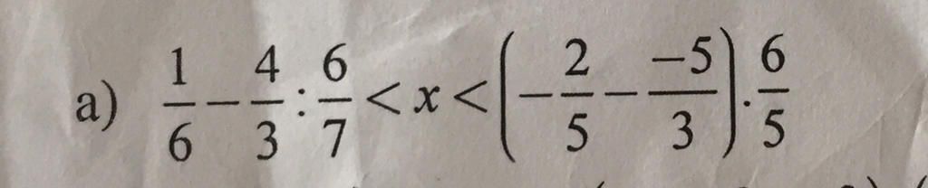 `\frac{1}{6}-\frac{4}{3}:\frac{6}{7}<x<(-\frac{2}{5}-\frac{-5}{3}). \frac{6}{5}`