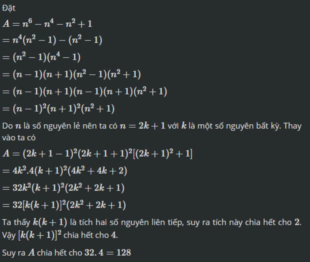 ` Và n^2 + 1` chẵn `=> 8( n^2 + 1 )( n - 1 )( n + 1 ) \vdots 128 ( 3 )`