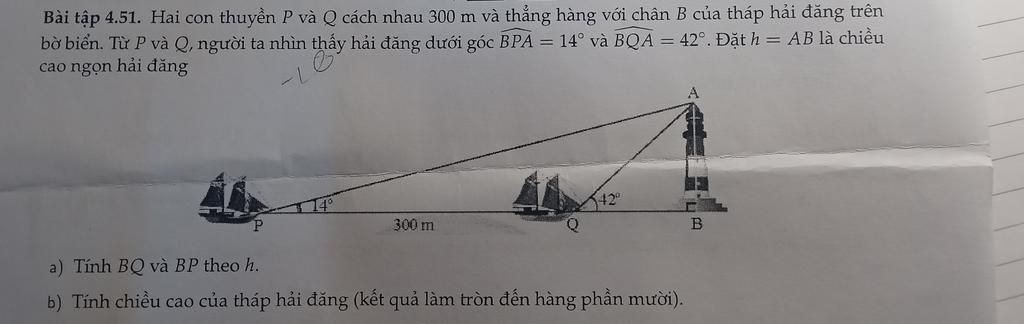 $\tan42^o=\dfrac{h}{BQ}\to BQ=\dfrac{h}{\tan42^o}$