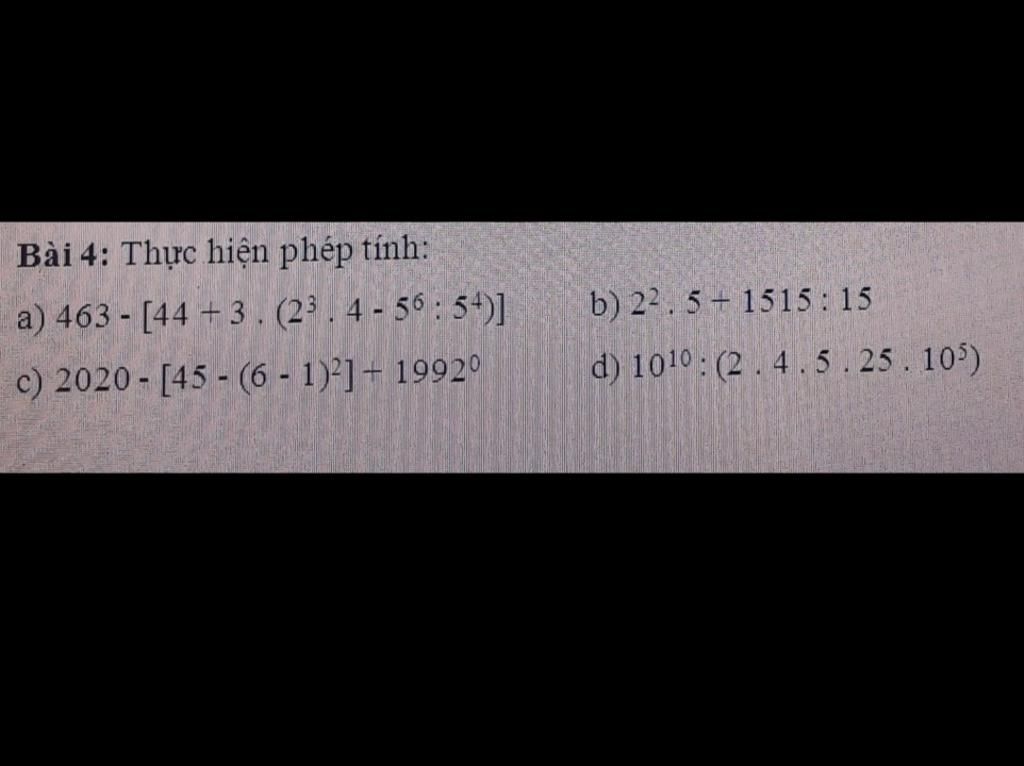 ` a) 463 - [ 44 - 3 xx ( 2^3 xx 4 - 5^5 : 5^4)] `