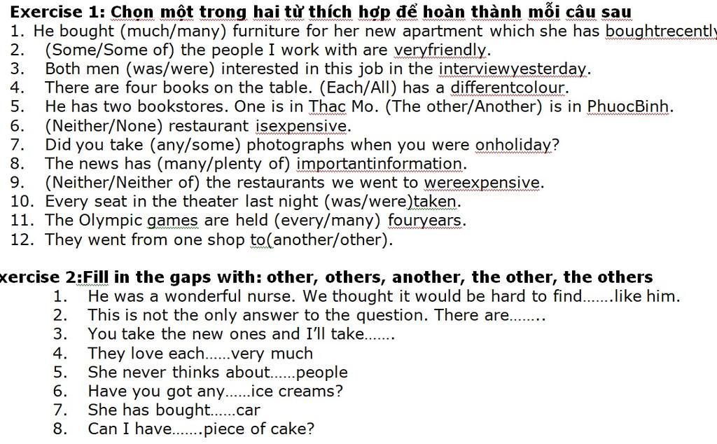Exercise 1: Chọn một trong hai từ thích hợp để hoàn thành mỗi câu sau