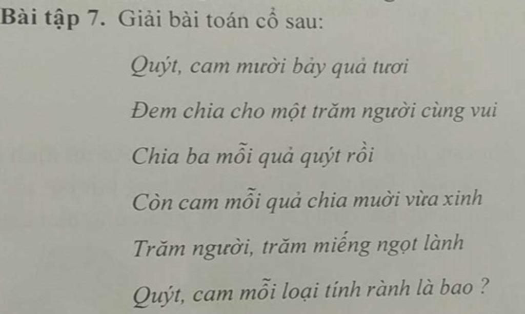 Chia ba mỗi quả quýt rồi, còn cam mỗi quả chia muời vừa xinh, ta có phương trình: